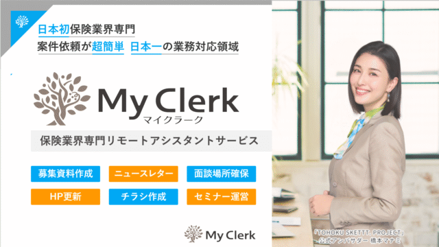 保険業界専門オンライン秘書サービスMyClerkは、「ひと」×「デジタル」でFP業界の未来をつくる をミッションに掲げ2019年にサービス開始以降、多くの方にご利用頂き顧客数が16倍へと拡大。一般的な事務業務からアフターフォローサービス、デジタルまわりのサポート、資料作成やセミナー司会など幅広く対応しています。業界特有のコンプライアンスを理解した運営をしているため安心してお使いいただけ、皆様のバックオフィスとして広域の代理店様はじめ生保・損保問わず幅広い代理店様にご利用いただいております。引き続きマイクラーク一同皆様のより一層の生産性向上と業務効率化、業績向上につながるサポートに邁進してまいります。