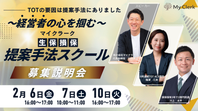 2026年2月6日(金)2月7日(土)2月10日(火)開催まであと13日 受付中TOTの要因は提案手法にありました ~経営者の心を掴む~ マイクラーク 生保損保 提案手法スクール 募集説明会