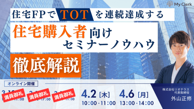 2026年03月12日(木)3月13日(金)3月18日(水)開催終了 受付終了~住宅FPでTOTを連続達成する~ 住宅購入者向けセミナーノウハウ徹底解説