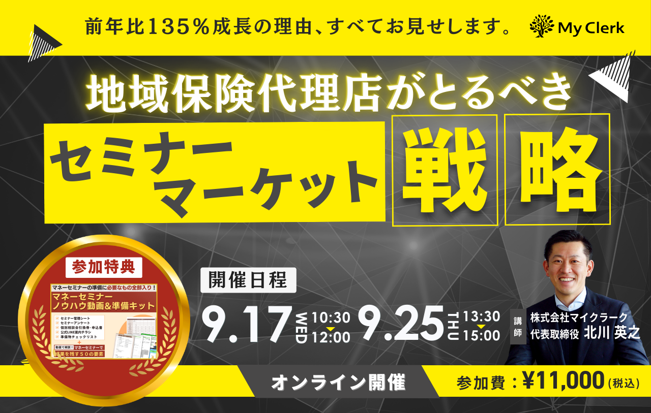 地域代理店がとるべき、セミナーマーケット戦略 2017年創業来、マネーセミナーをベースにマーケットを構築し、新人からベテランまで誰でも取り組める環境づくりをすることでわずか8年で2社30名の社員を確保し、前年比135%で成長を続けるノウハウを公開いたします。マネーセミナーのマーケットを持つことで採用に優位性があり、マーケット提供できることで定着率が向上します。マネーセミナーから創出する手数料は毎年6000万円を超え、収益の安定基盤となっています。保険代理店㈱ワオナスの経営者として、また、保険業界専門アシスタント、㈱マイクラークの代表として携わった累計900回以上のマネーセミナーから見える最適解とは? スピーカー:株式会社マイクラーク 代表取締役 北川 英之 |